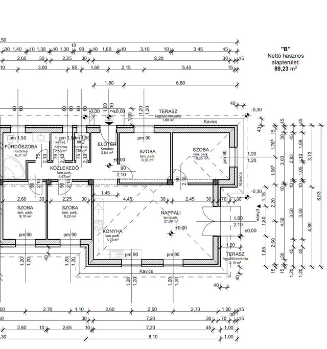 Nappali és konyha: 27,08 m² és 5,75 m²