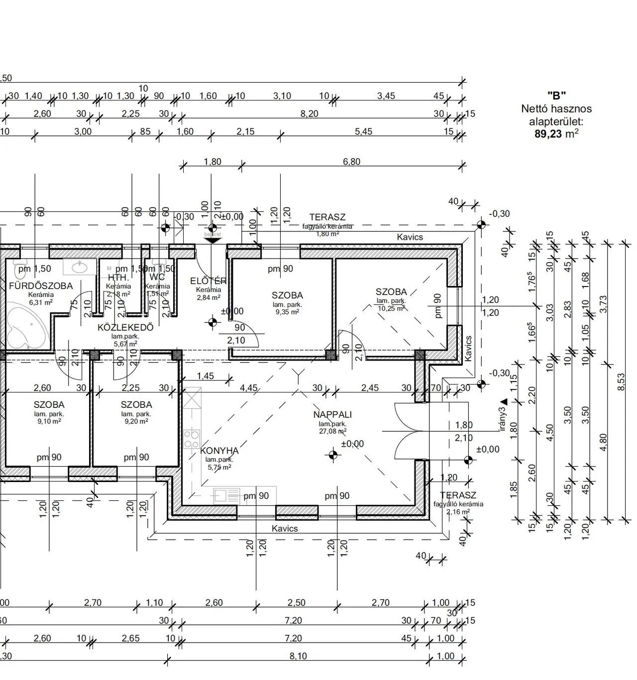 Nappali és konyha: 27,08 m² és 5,75 m²